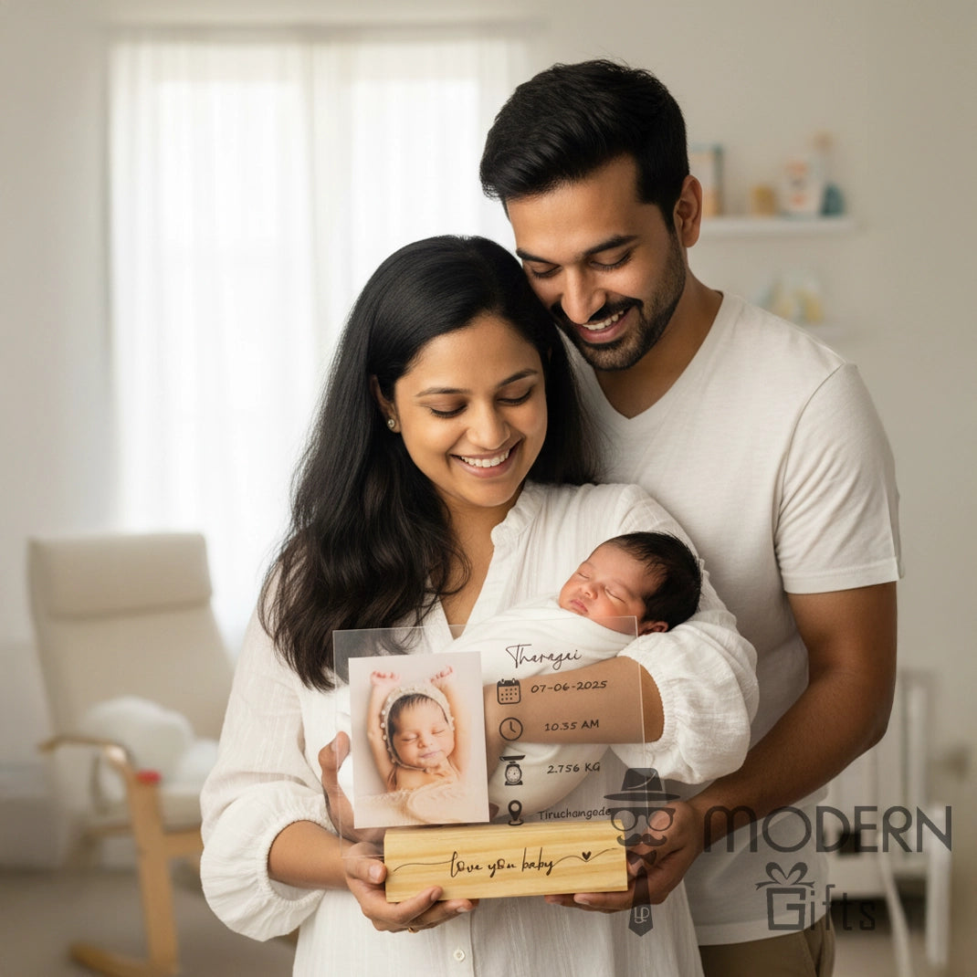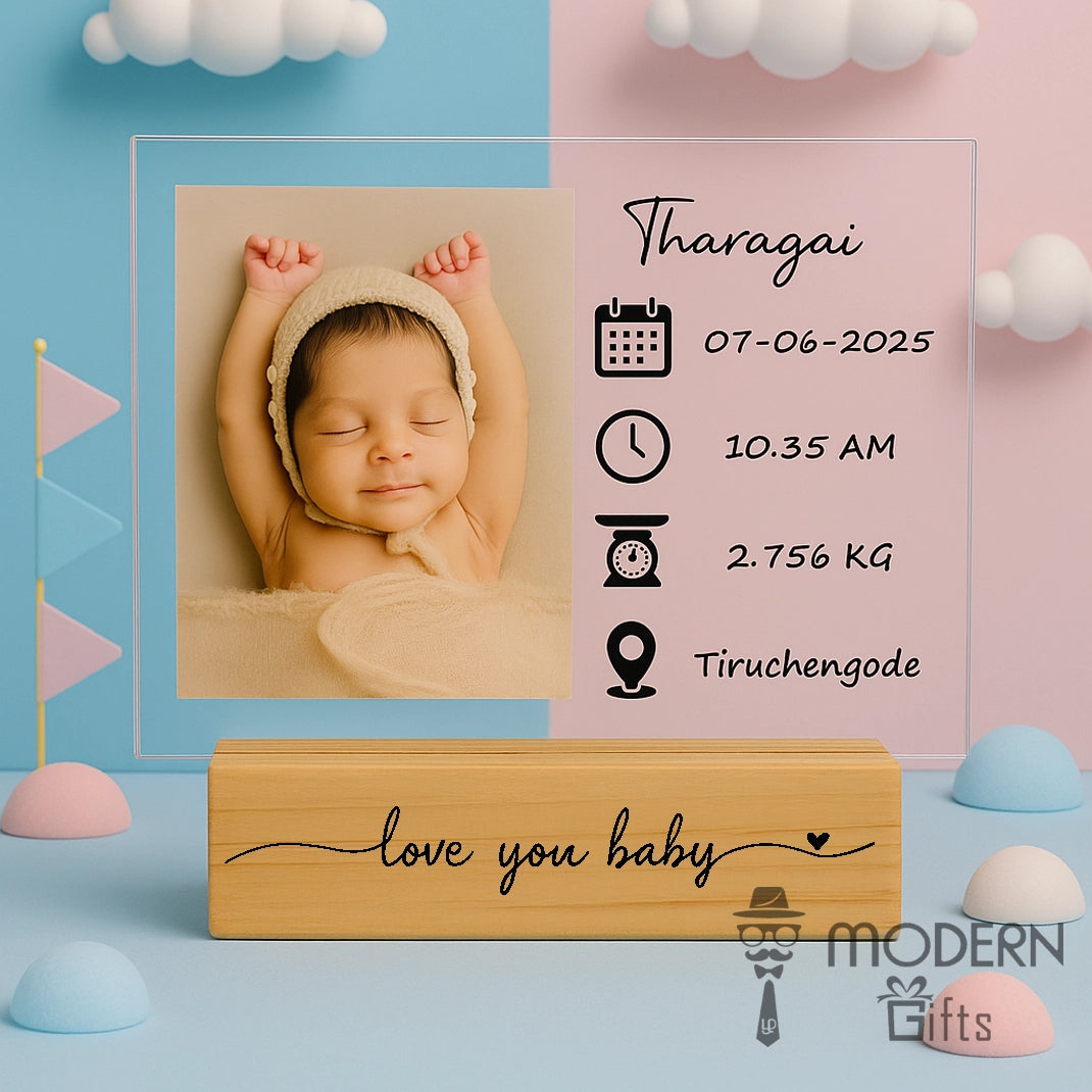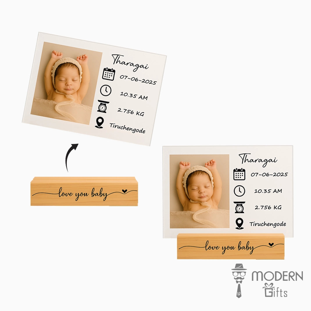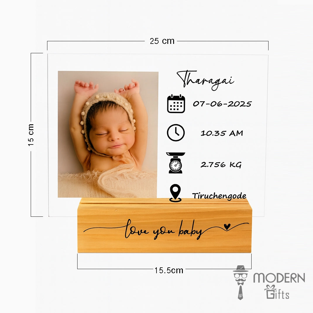 Celebrate the arrival of your little one with this Personalized Baby Birth Details Acrylic Frame. Crafted with a premium clear acrylic sheet and a sturdy wooden base, this keepsake beautifully displays your baby’s first photo along with their name, birth date, time, weight, and birthplace. The minimal and elegant design makes it a perfect nursery décor piece, a heartfelt gift for new parents, or a treasured memory keepsake that will last a lifetime. Each frame is customized with love, ensuring your baby’s precious first details are captured in style.