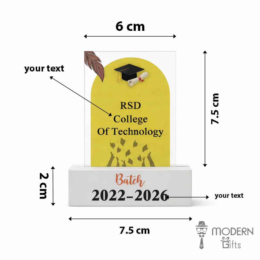 Celebrate achievements and memories with this customized farewell acrylic plaque. Personalised with college name, batch year, and design, it makes a thoughtful return gift that beautifully marks the end of an academic journey and the beginning of new dreams.