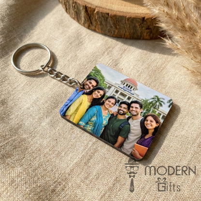 A thoughtful customized farewell return gift keychain, designed to keep batch memories close forever. The front side features a cheerful farewell illustration with batch years, while the back side can be personalized with a group photo or custom image, making it a perfect keepsake for students and classmates.