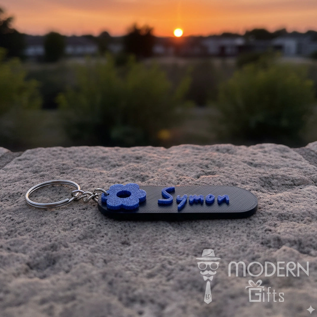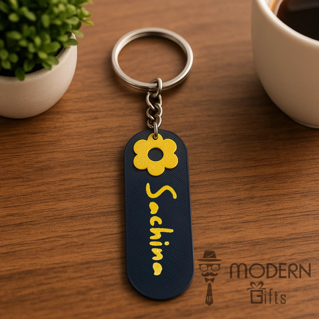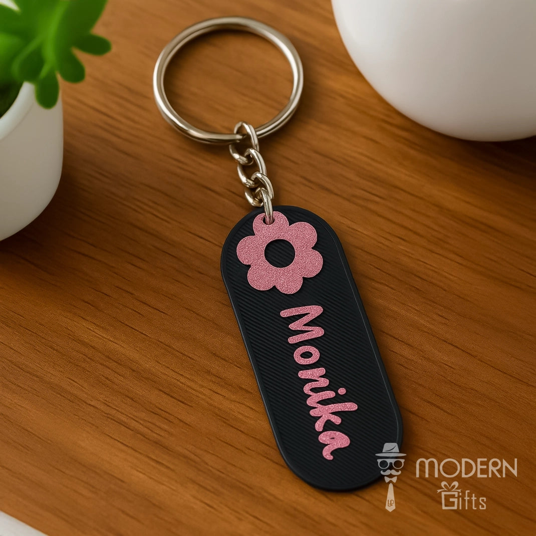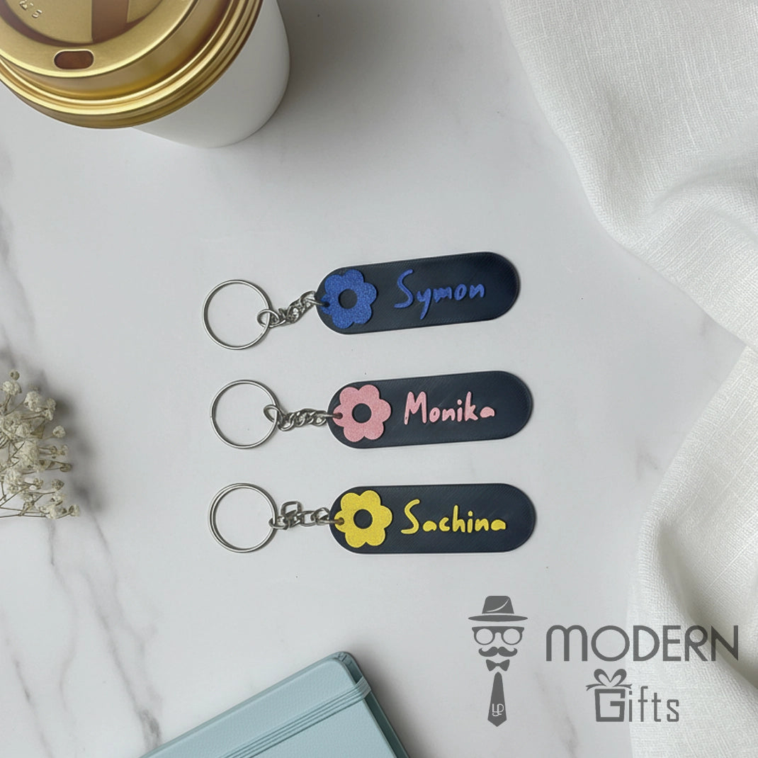 Add a touch of personality to your everyday essentials with our Customized Name Keychains. Each keychain is crafted with a sleek black base and adorned with a vibrant flower cut-out, available in colors like blue, pink, and yellow. Your chosen name is beautifully engraved in matching bright shades, making it a perfect blend of style and utility.