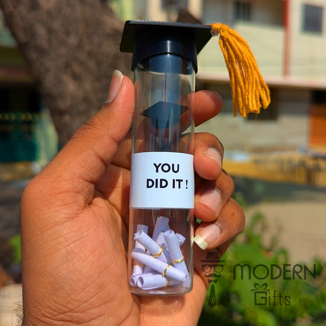 Celebrate the proud moment of graduation with our Graduation Bottle—a unique and memorable gift for every graduate! This special bottle comes with a stylish graduation hat on top, symbolizing success and achievement. It is beautifully designed with inspiring quotes that reflect the hard work and dedication of the graduate.