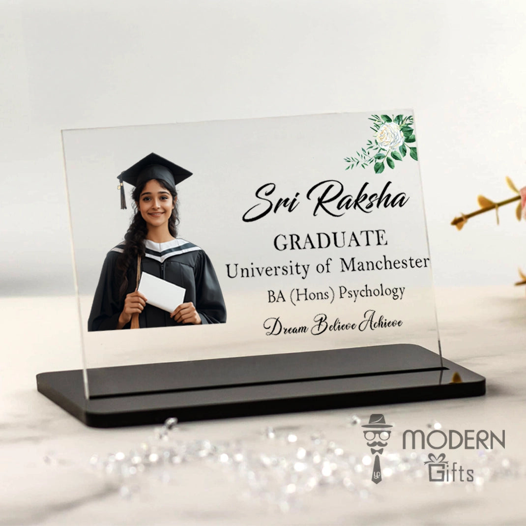 Celebrate academic success with our Customized Graduation Stand, a perfect keepsake for graduates! This elegant stand is designed with high-quality acrylic and can be personalized with a photo, name, and university name, making it a truly unique and memorable gift.