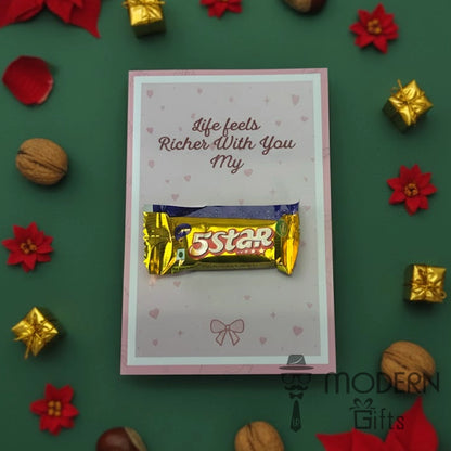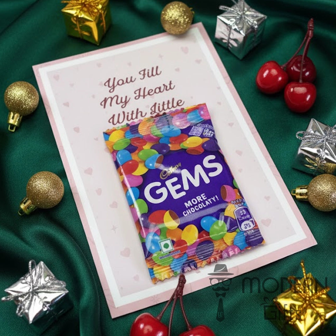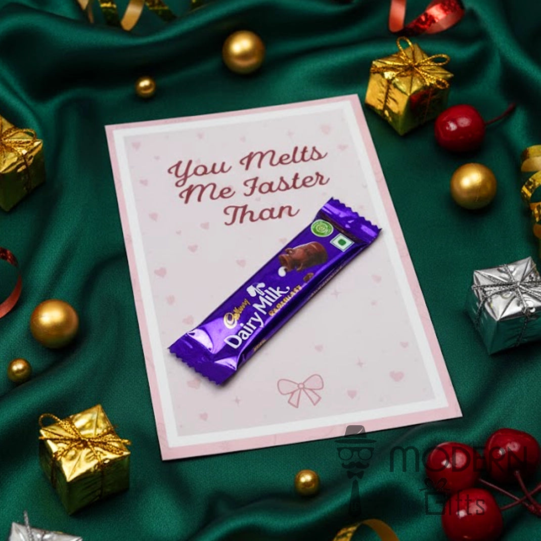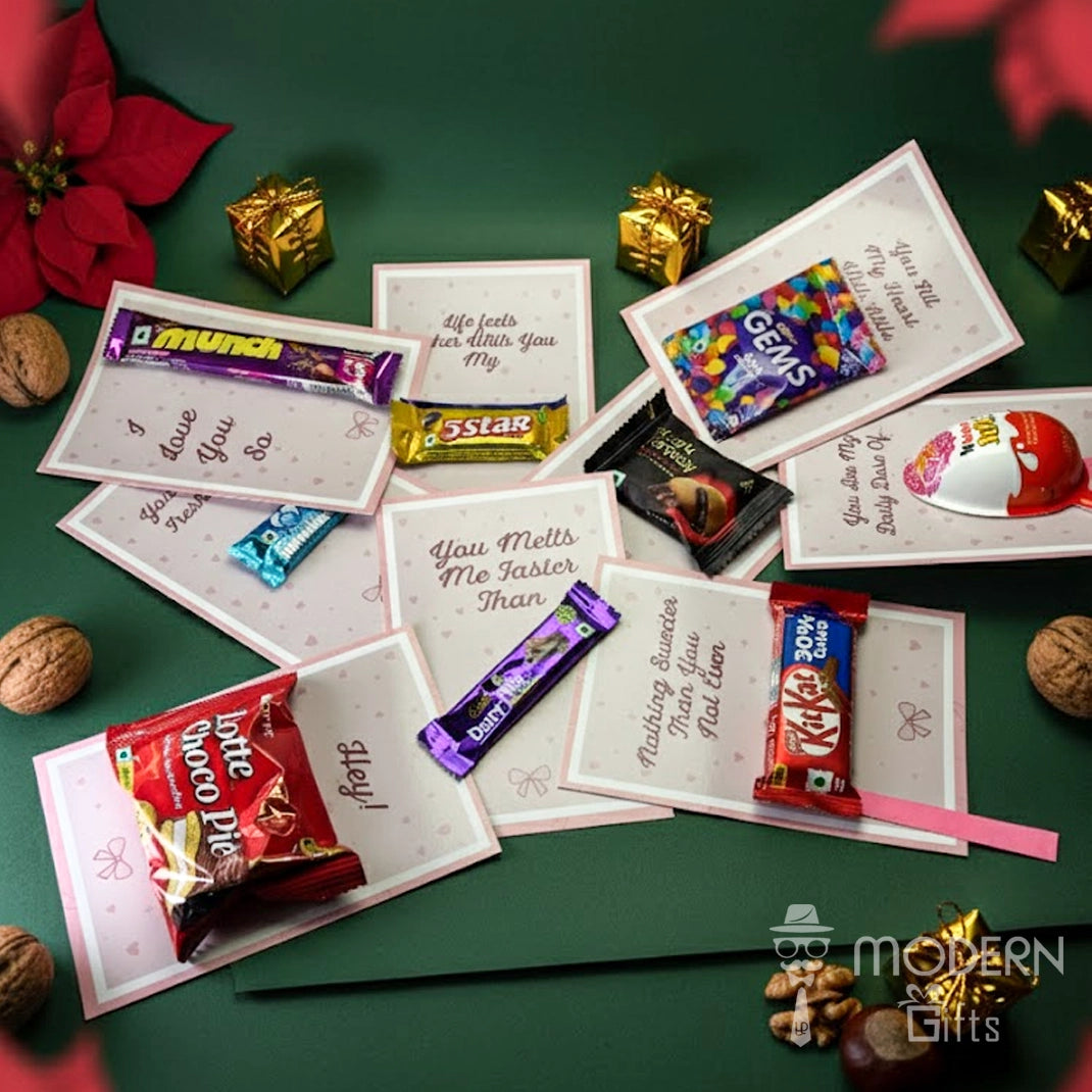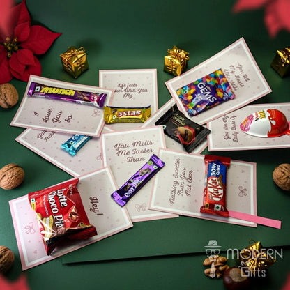 Celebrate sweetness and emotions together with our Happy pack Chocolate Greeting Card Gift Set. Each card is uniquely paired with delicious chocolates like Kinder Joy, Dairy Milk, KitKat, Munch, 5 Star, Choco Pie,Dark fantasy,Center Fresh and Gems, each featuring a cute and romantic message. Perfect for gifting to your loved ones on special occasions like birthdays, anniversaries, Valentine’s Day, or just to express your love. A thoughtful and sweet combo that melts hearts just like chocolates do!