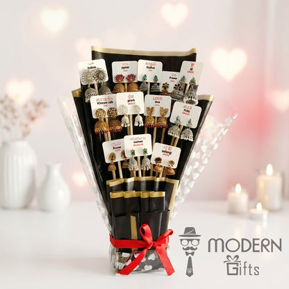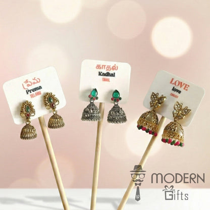 This stunning bouquet is created using premium designer earrings arranged like a luxury bouquet, with each pair displayed alongside the word LOVE written in different languages such as Tamil, Hindi, Japanese, Korean, Telugu, Marathi and more - symbolising that your love speaks every language.