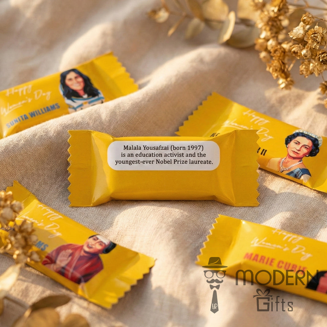 Celebrate the spirit of women's empowerment with our beautifully curated Women’s Day Chocolate Box – Inspirational Women Edition. This premium chocolate gift box features individually wrapped chocolates showcasing iconic women leaders and achievers such as Malala Yousafzai, Marie Curie, Indira Gandhi, Kalpana Chawla, Mother Teresa, Sunita Williams, Avvaiyar, and Dr. Muthulakshmi Reddy.